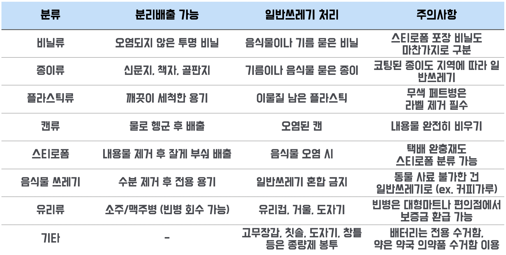 - 라벨 제거, 내용물 비우기, 세척 필수