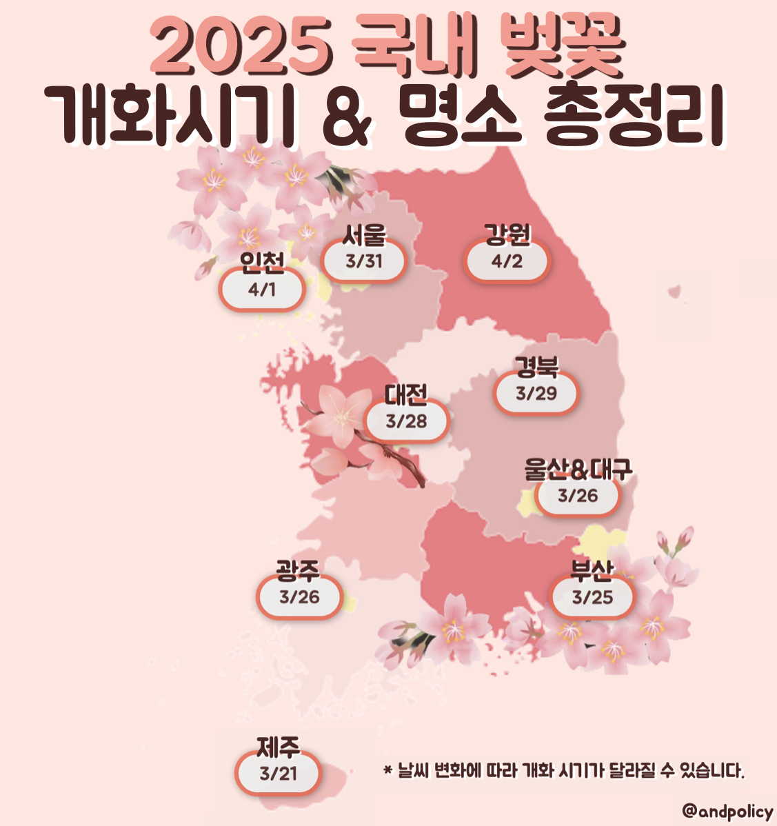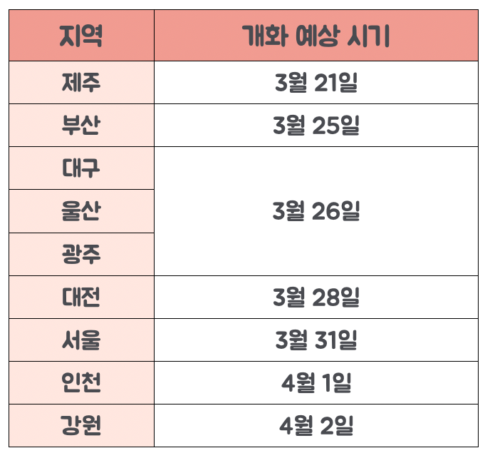 2025년 봄, 전국의 벚꽃이 예년보다 약간 이르게 개화할 것으로 예상됩니다. 아래는 지역별 예상 개화 시기입니다